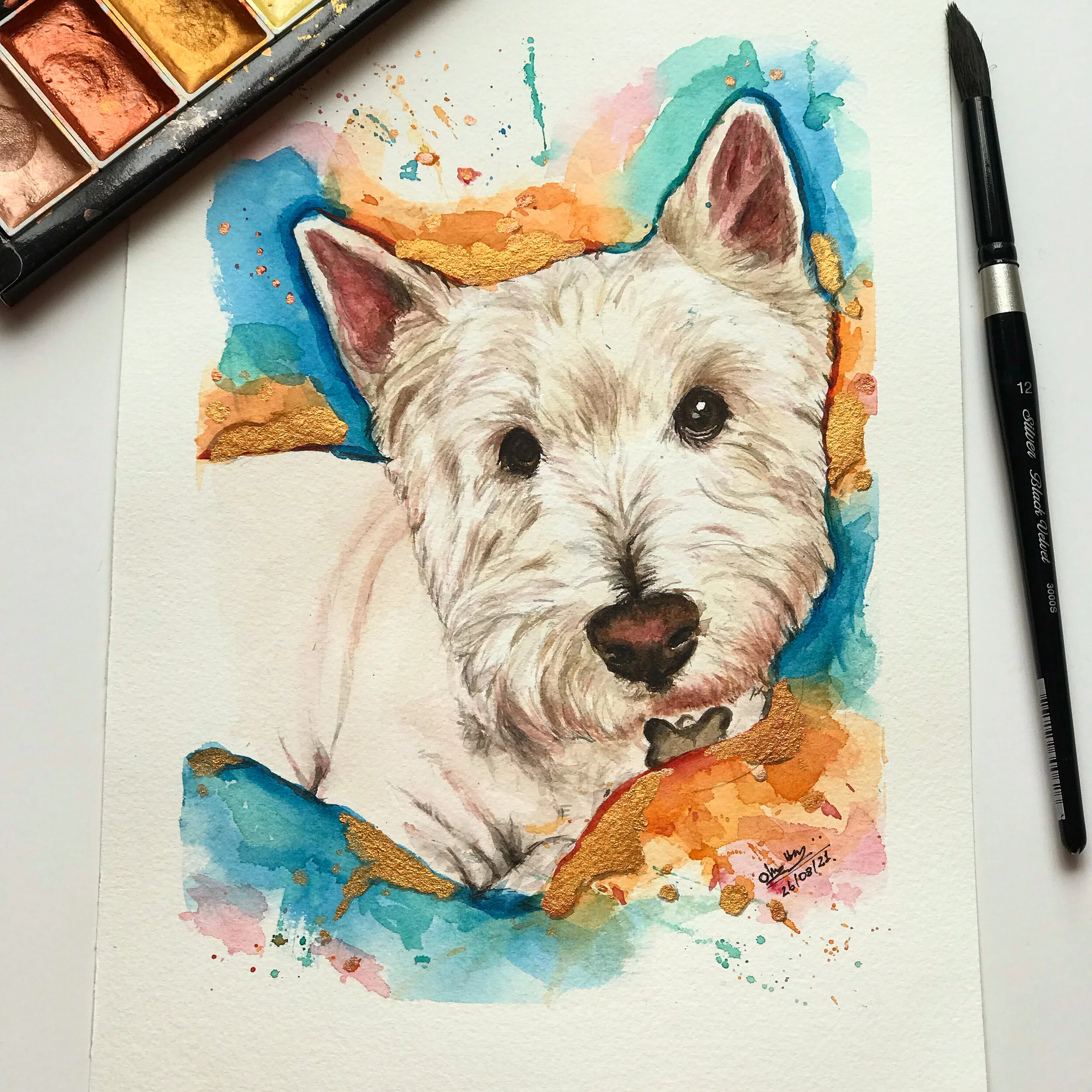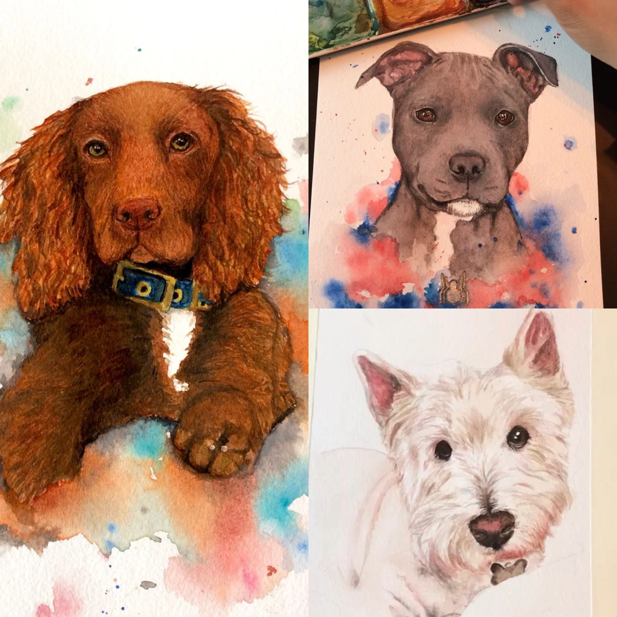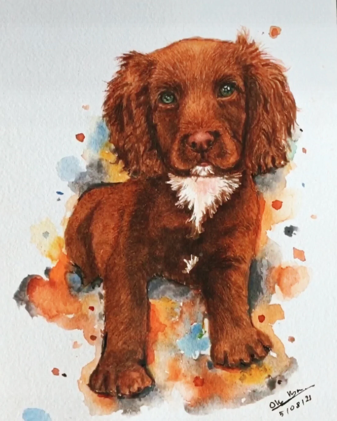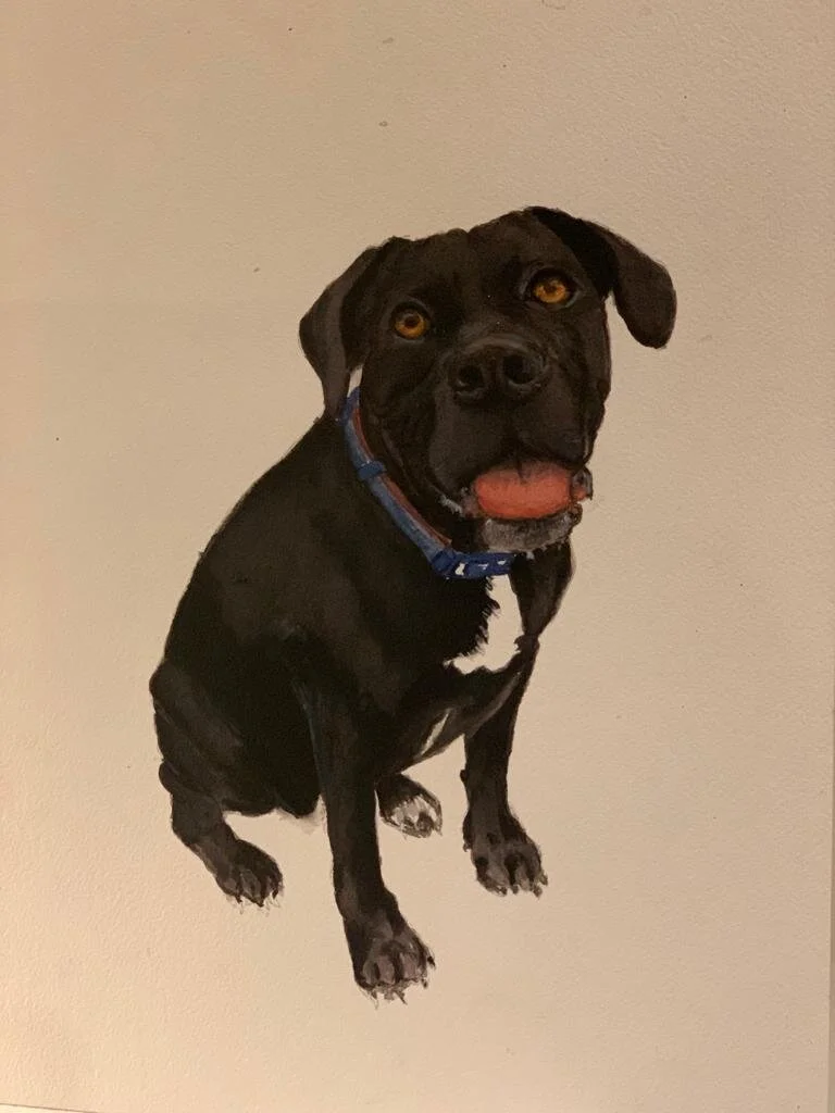 In the end, after painting so many doggies - I had to bring Max into our family. This is him as a puppy and the first of 3 I did across his life growing into an adult. If you want a splashy background like this - just let me know!