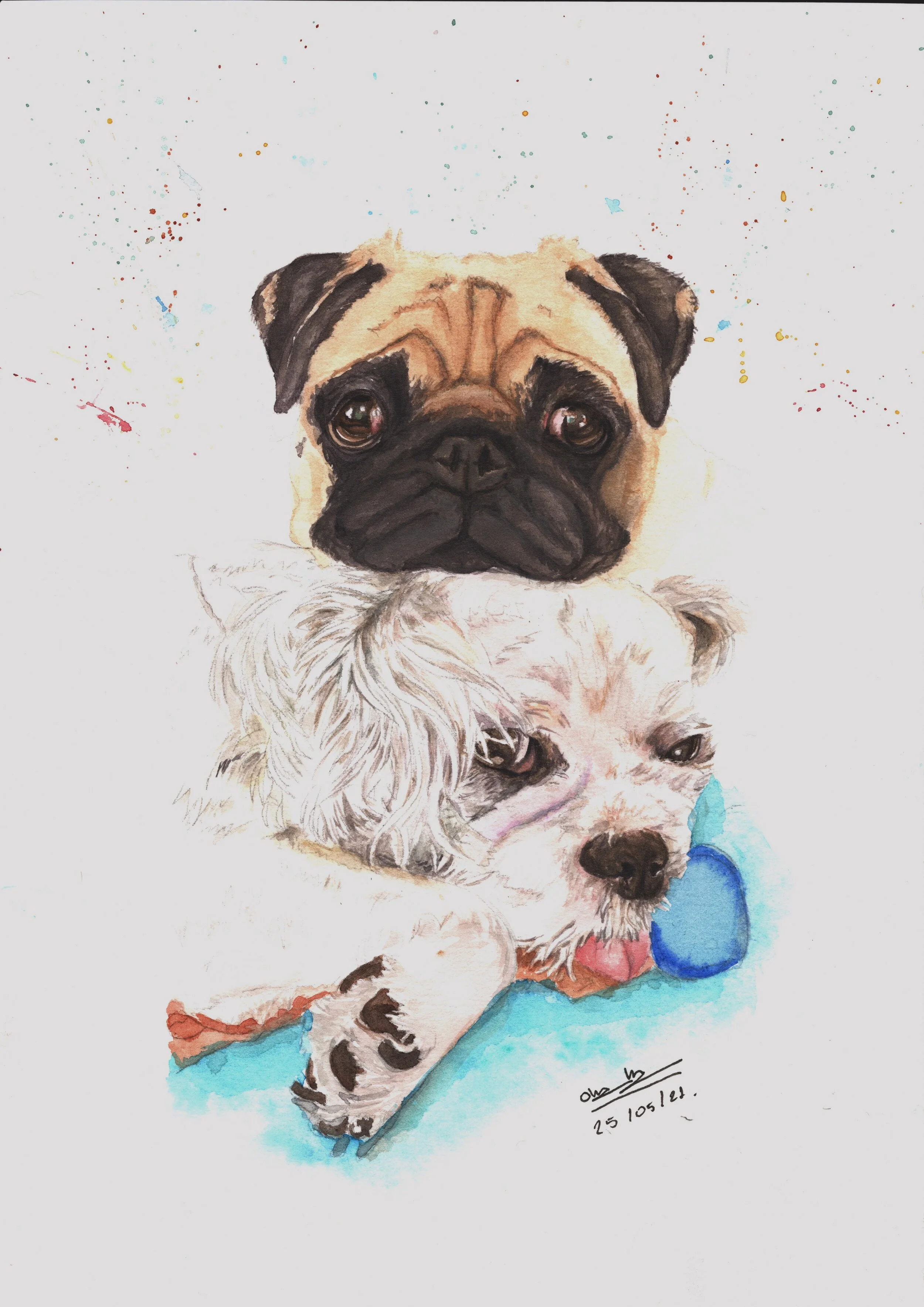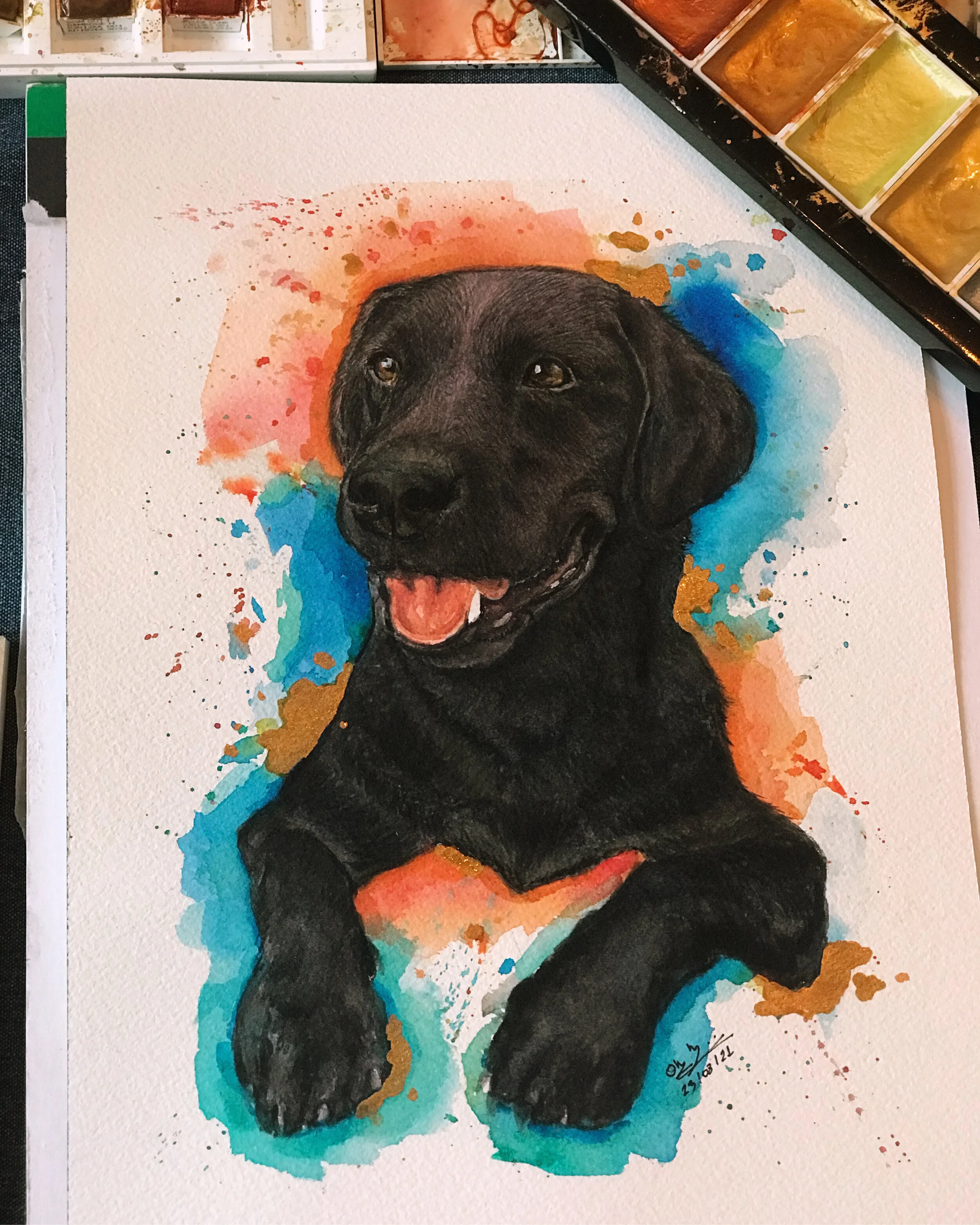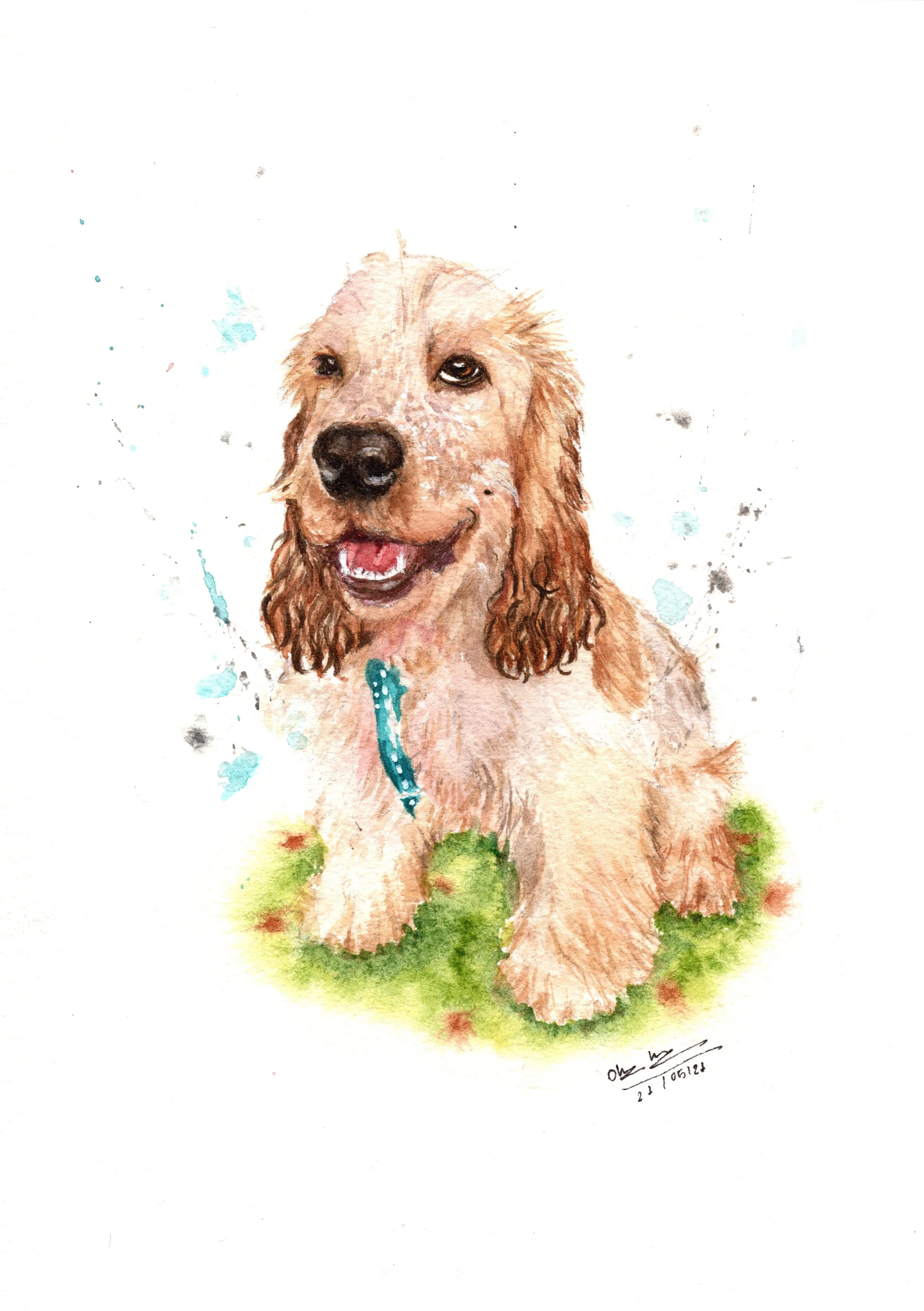 In the end, after painting so many doggies - I had to bring Max into our family. This is him as a puppy and the first of 3 I did across his life growing into an adult. If you want a splashy background like this - just let me know!